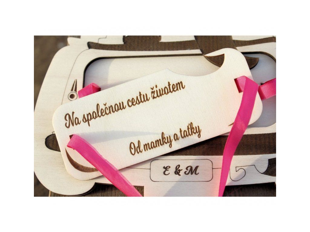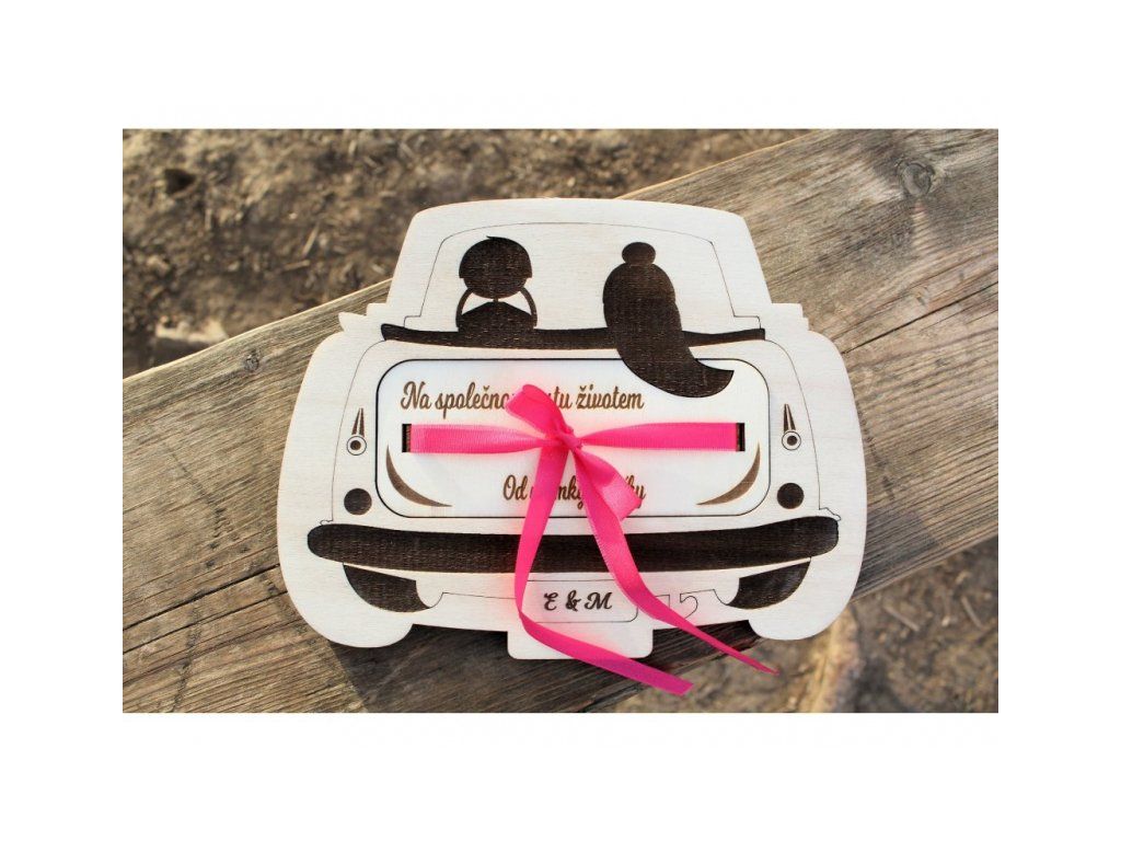 Luxusní "obálka" pro novomanžele umožňuje darovat peníze originální cestou. Bankovky se umístí pod středový odnímatelný kryt, který se pak zaváže stužkou. Dodáváme bez stužky.