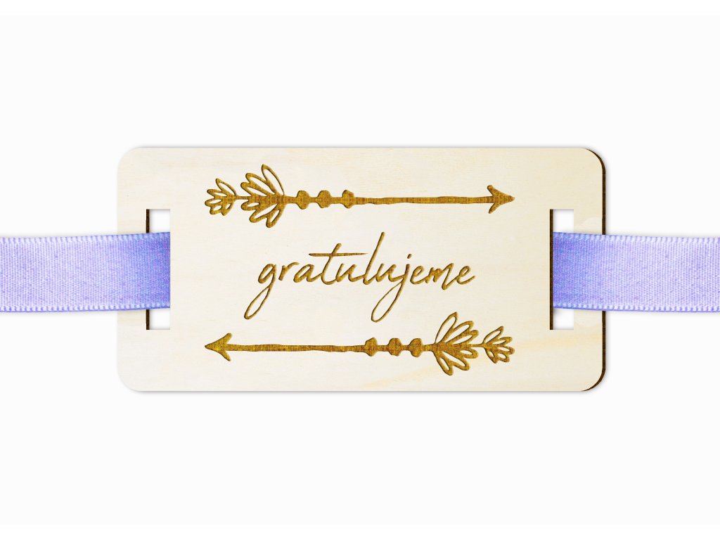 Cedulka je vyrobena z kvalitní topolové překližky s jemnou kresbou dřeva. Text „Gratulujeme“ i dekorativní motiv šipek jsou pečlivě vypálené, díky čemuž působí elegantně a přirozeně. Průřezy po stranách umožňují snadné provlečení stuhy a pevné uchycení na dárku.