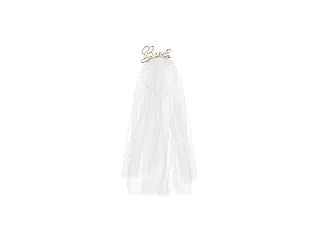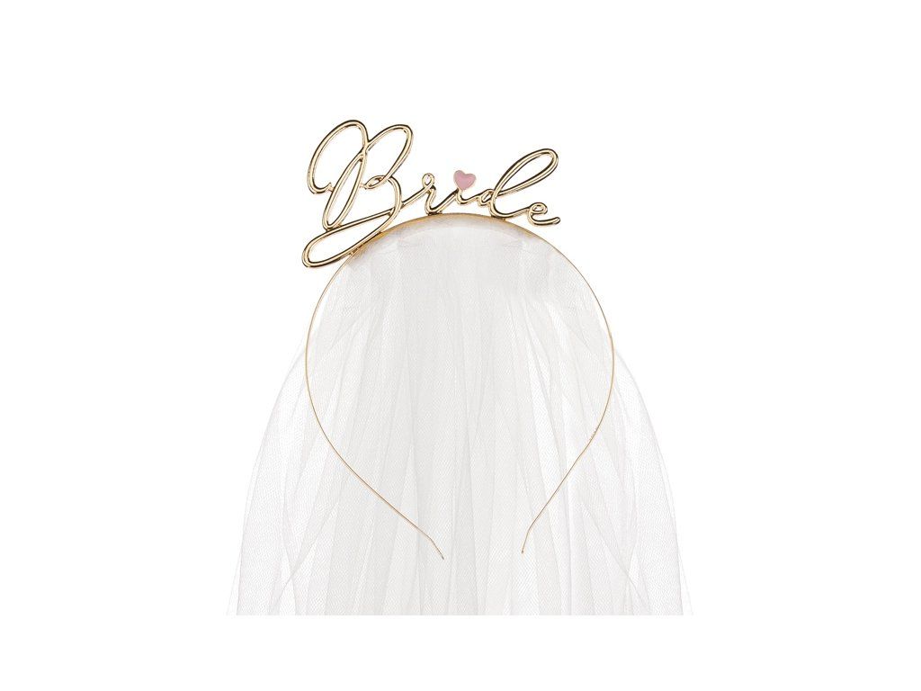 Kovová čelenka s nápisem Bride ve zlaté barvě s bílým závojem (délka cca 50 cm)