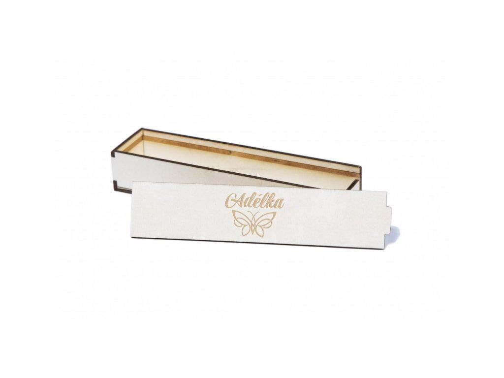 Podlouhlá dárková krabička s vysouvacím víkem hodící se na darování podvazku. Gravírovaný text vám upravíme podle vašich představ.