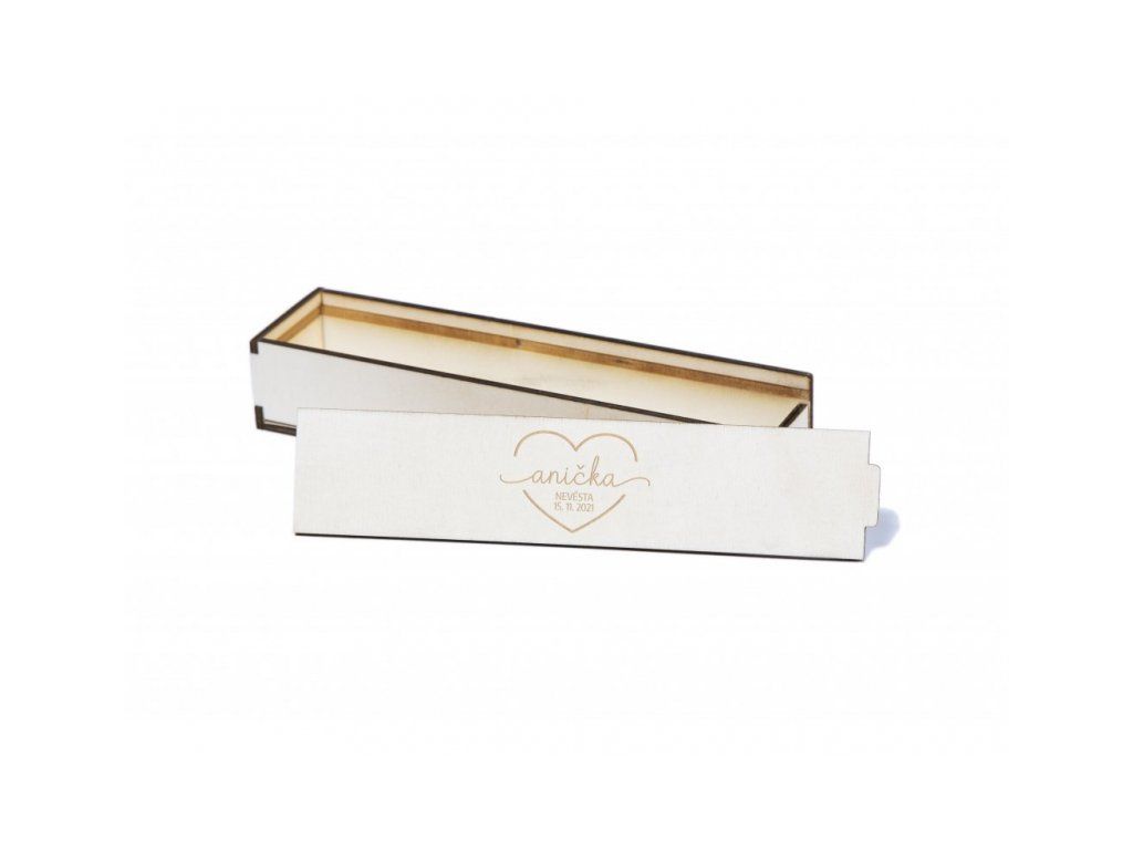 Podlouhlá dárková krabička s vysouvacím víkem hodící se na darování podvazku. Gravírovaný text vám upravíme podle vašich představ.