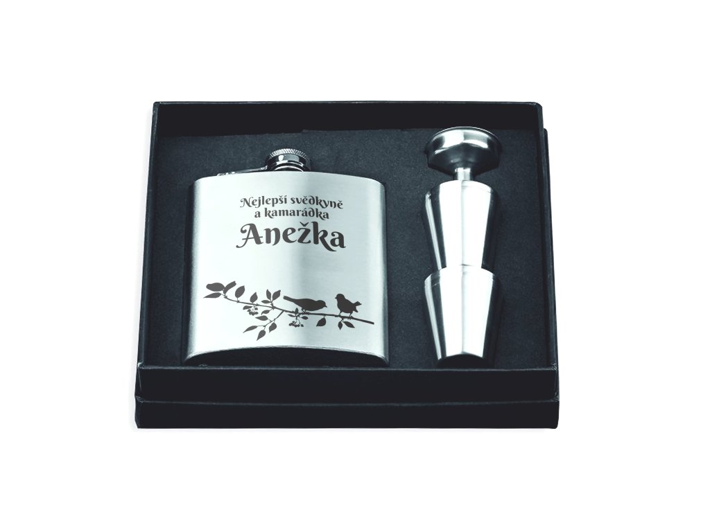 Tato dárková placatka pro svědkyni je krásným způsobem, jak poděkovat za podporu, přátelství a všechny společné chvíle, které ke svatbě neodmyslitelně patří. Jemný motiv s ptáčky a osobní gravírování vytváří originální památku, která bude připomínat výjimečný den ještě dlouho poté.