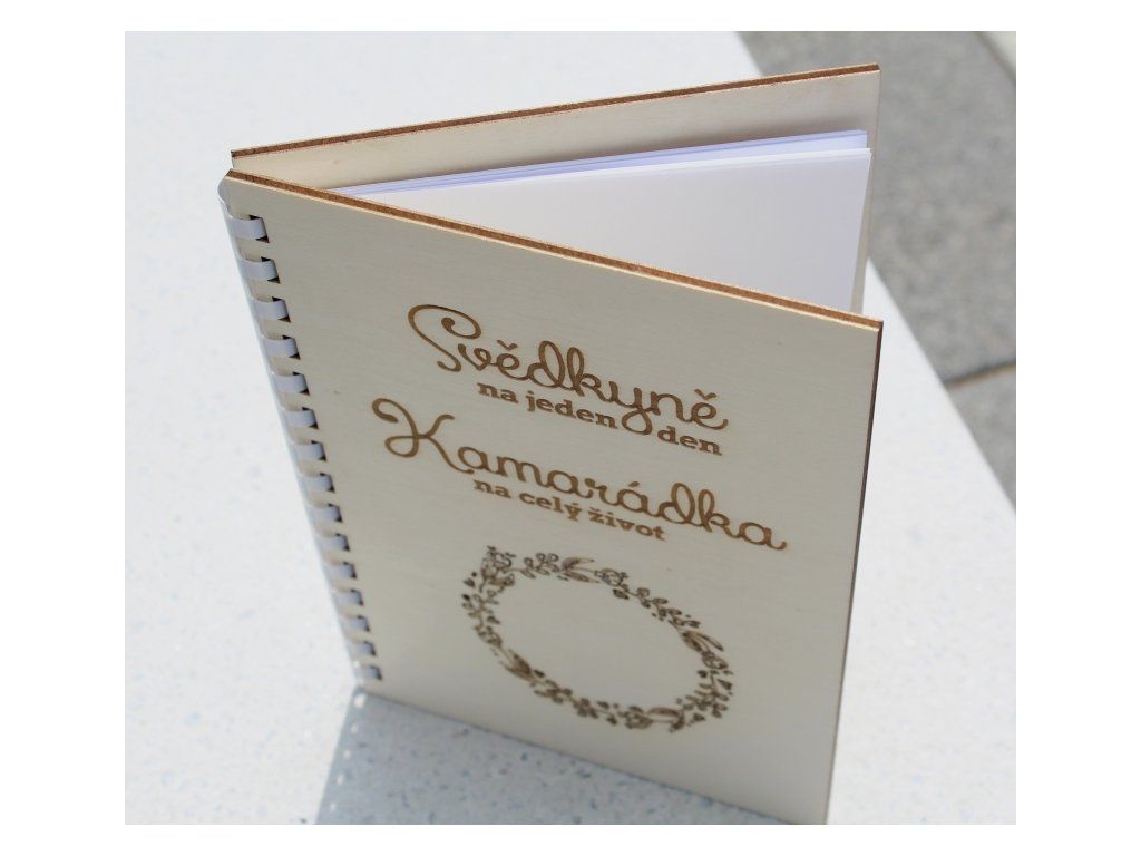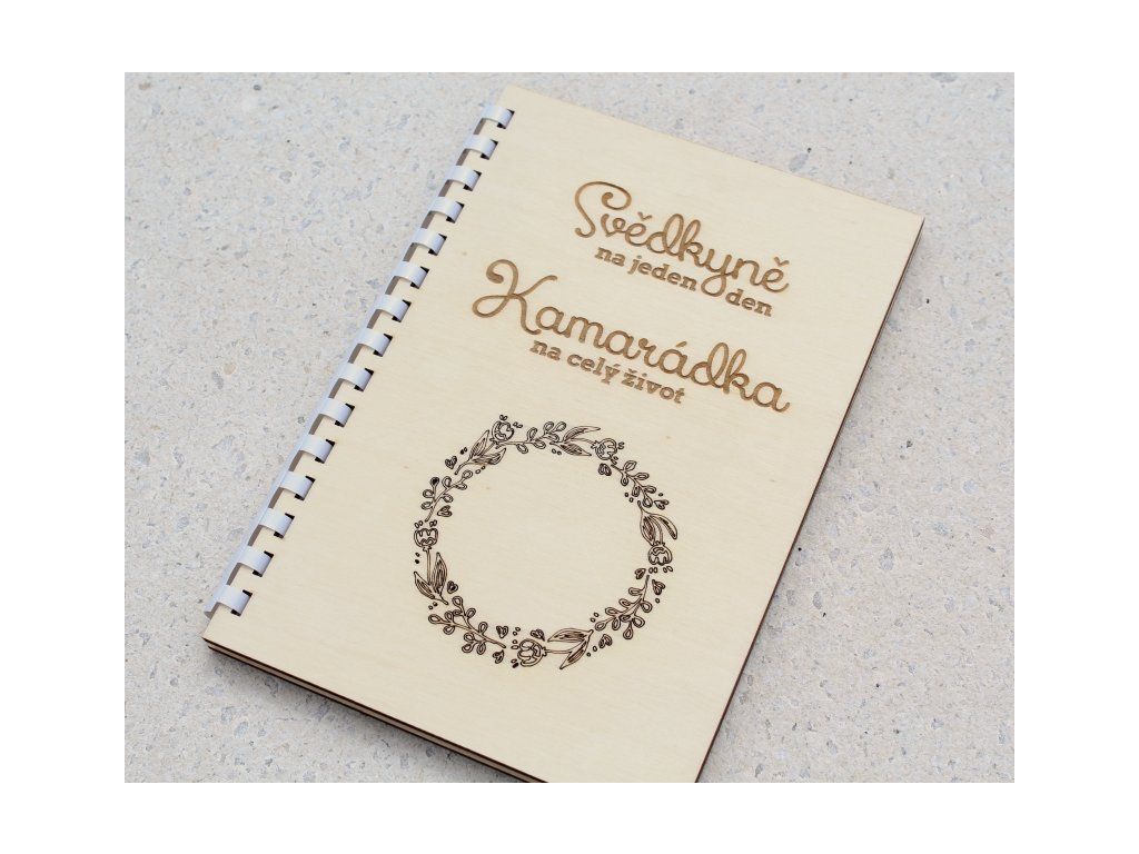 Deník s dřevěnými deskami je osobitým darem při žádosti o svědectví. Deník poslouží pro poznámky, nápady a plány svědkyně. Deník obsahuje 20 listů bílých papírů formátu A5.
