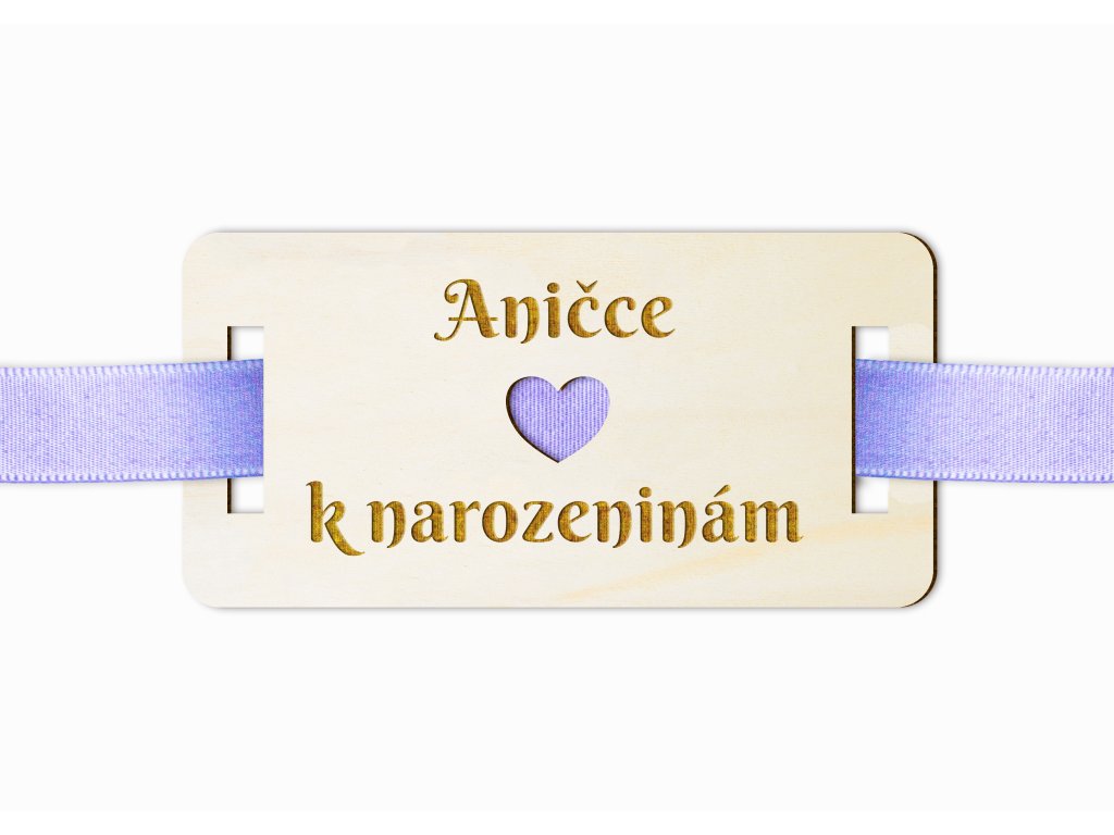 Dřevěná cedulka se jménem „k narozeninám“ na stuhu