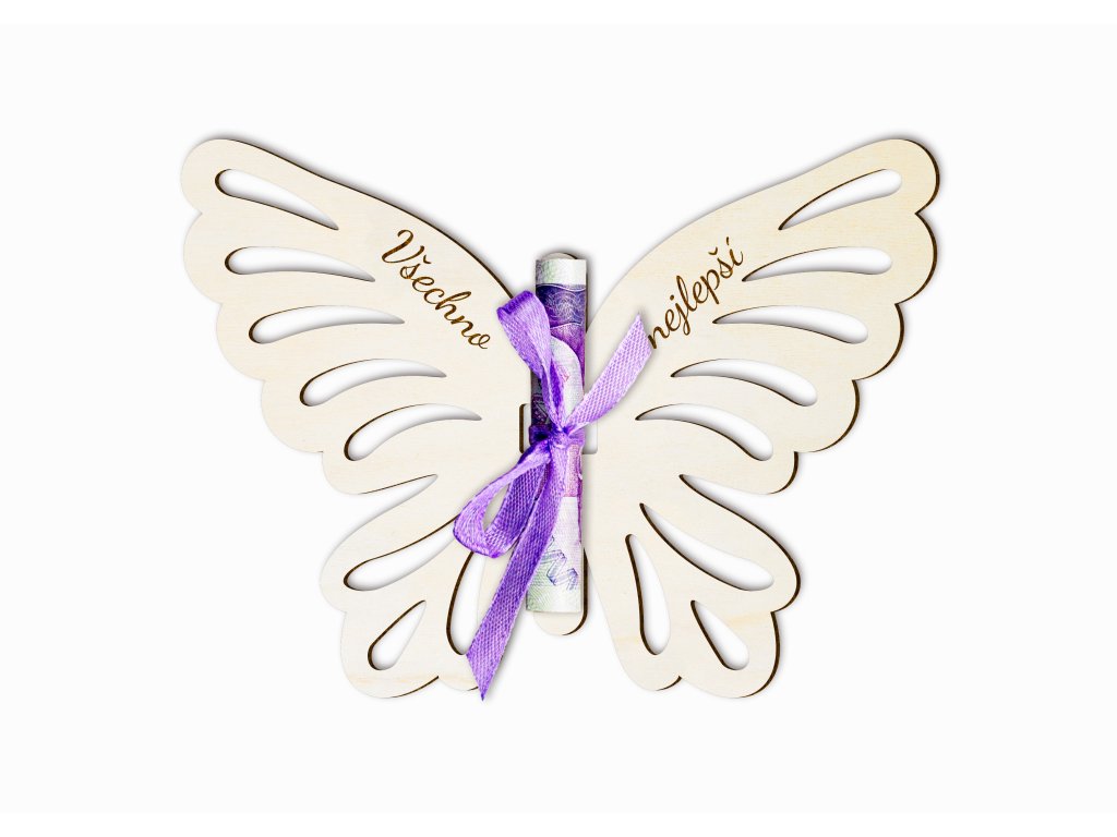 Dřevěná destička na peníze ve tvaru motýla s nápisem „Všechno nejlepší“ je originálním a dojemným způsobem, jak darovat finanční příspěvek k narozeninám, výročí nebo jiné slavnostní příležitosti. Motýl symbolizuje radost, proměnu a nové začátky, díky čemuž se destička stává nejen dárkem, ale i krásnou památkou.