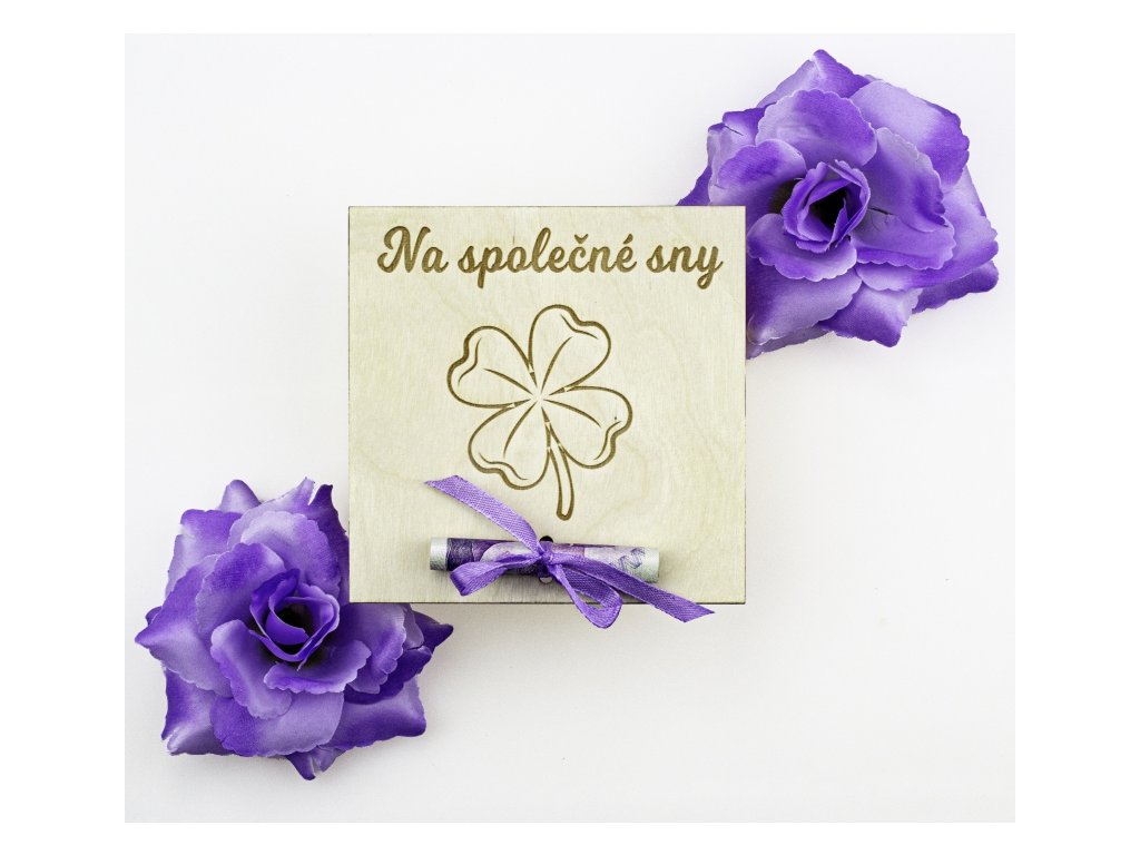Dřevěná svatební destička na peníze „Na společné sny“ – čtyřlístek pro štěstí