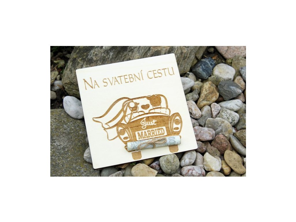 Dřevěná svatební destička na peníze „Na svatební cestu“ – auto