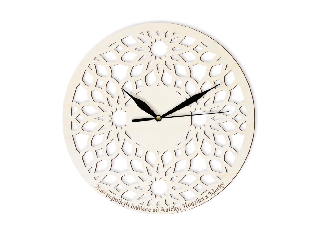 Tyto dřevěné hodiny nejsou jen ukazatelem času, ale i krásnou památkou. Díky vyřezávanému ornamentu působí jemně a elegantně a osobní text ve spodní části jim dodá jedinečný význam.