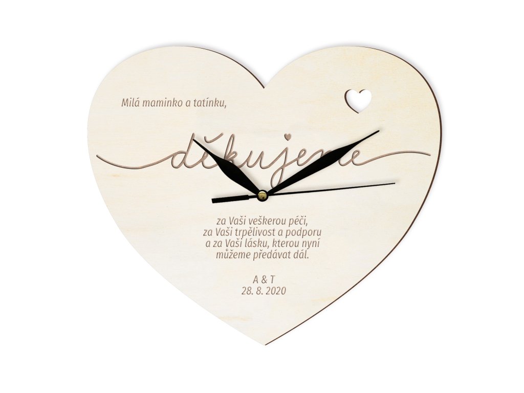 Hodiny lze upravit přesně podle vašich přání. Doplníme jména, iniciály, datum svatby nebo vlastní text. Díky preciznímu gravírování vznikne jedinečná památka, která bude rodičům každý den připomínat váš svatební den.