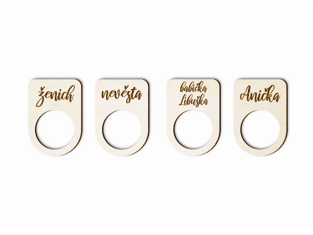 Na každý kroužek vyřežeme jméno hosta, oslovení nebo označení role na svatbě (např. ženich, nevěsta, babička, svědkyně). Text upravíme přesně podle vámi dodaného seznamu. Na přání lze změnit také typ písma nebo styl nápisu.