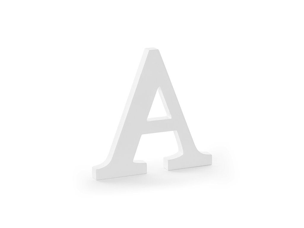 Dřevěné písmeno A bílé barvy, šířka cca 21,5 cm, výška cca 20 cm.