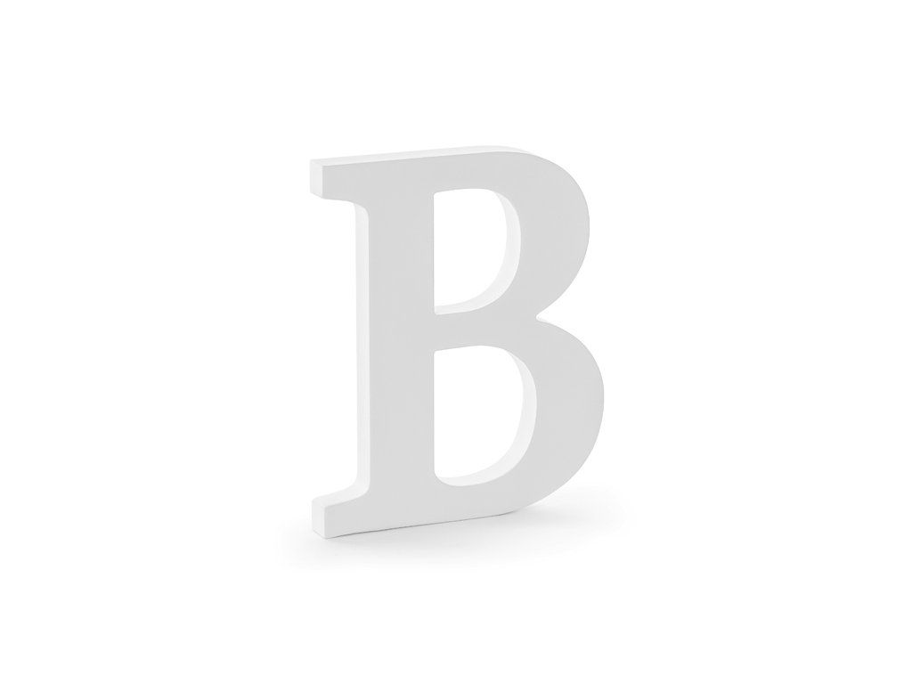 Dřevěné písmeno B bílé barvy, šířka cca 16,5 cm, výška cca 20 cm.