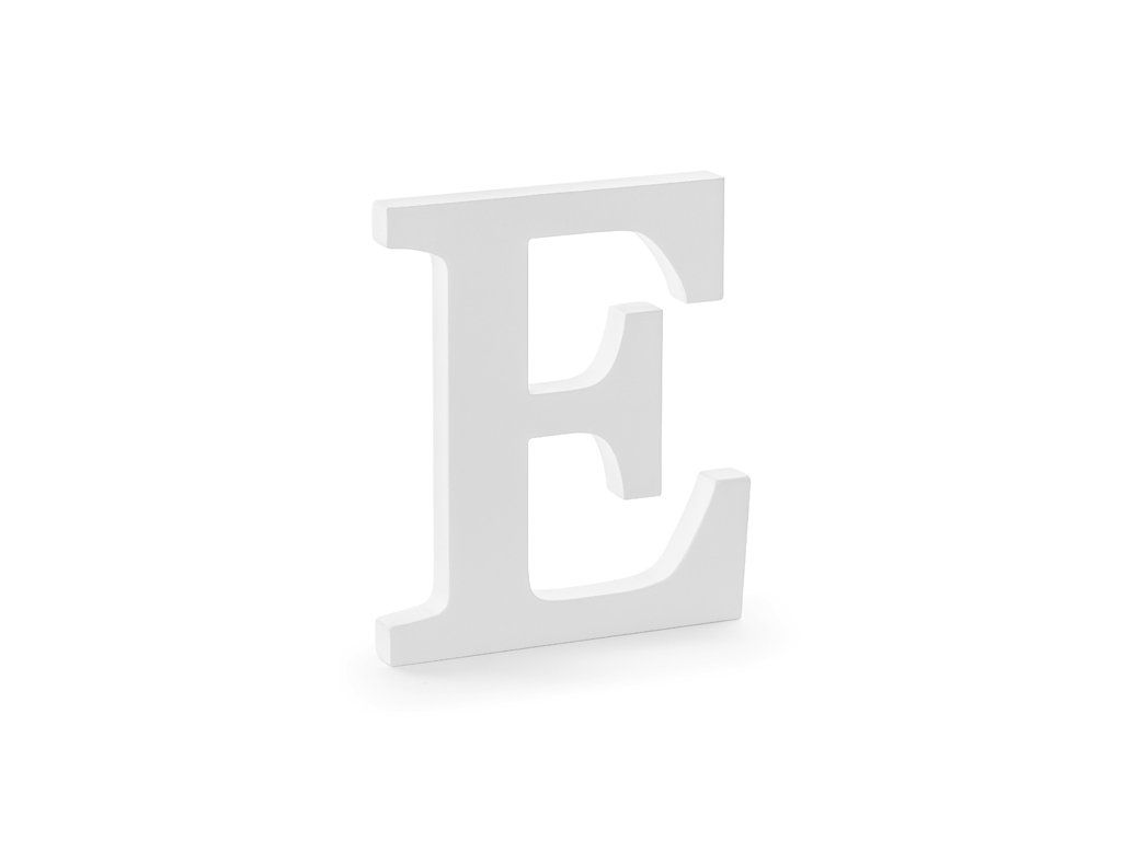 Dřevěné písmeno E bílé barvy, šířka cca 17 cm, výška cca 20 cm.