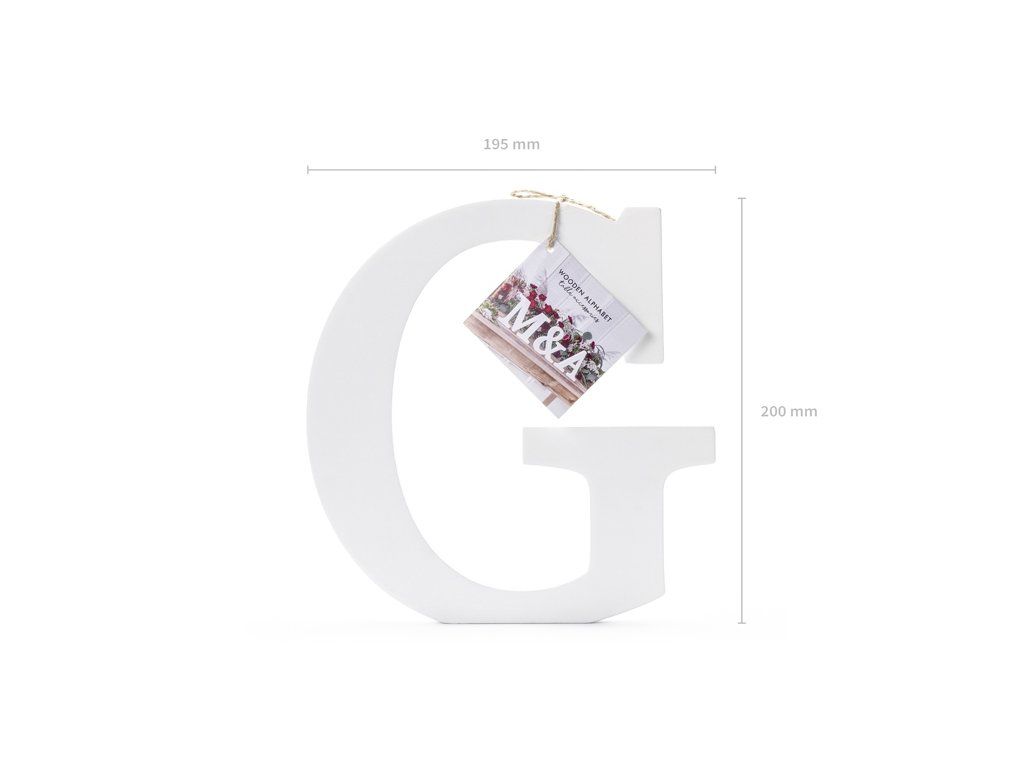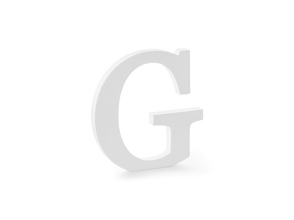 Dřevěné písmeno G bílé barvy, šířka cca 19,5 cm, výška cca 20 cm.