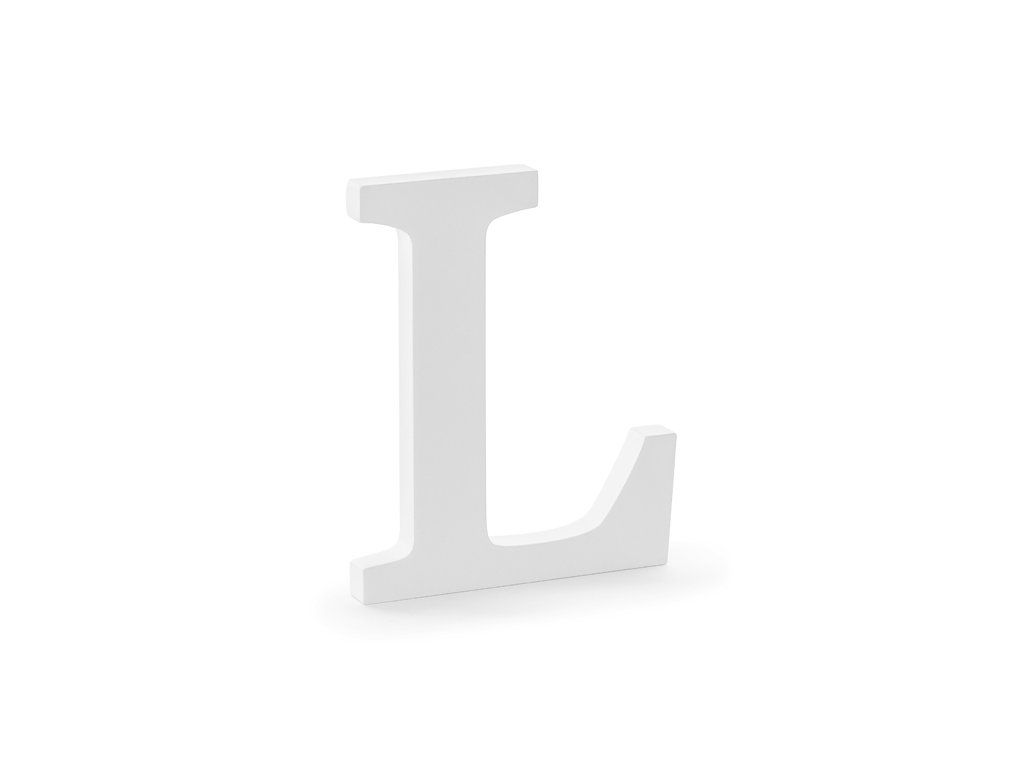 Dřevěné písmeno L bílé barvy, šířka cca 16 cm, výška cca 20 cm.