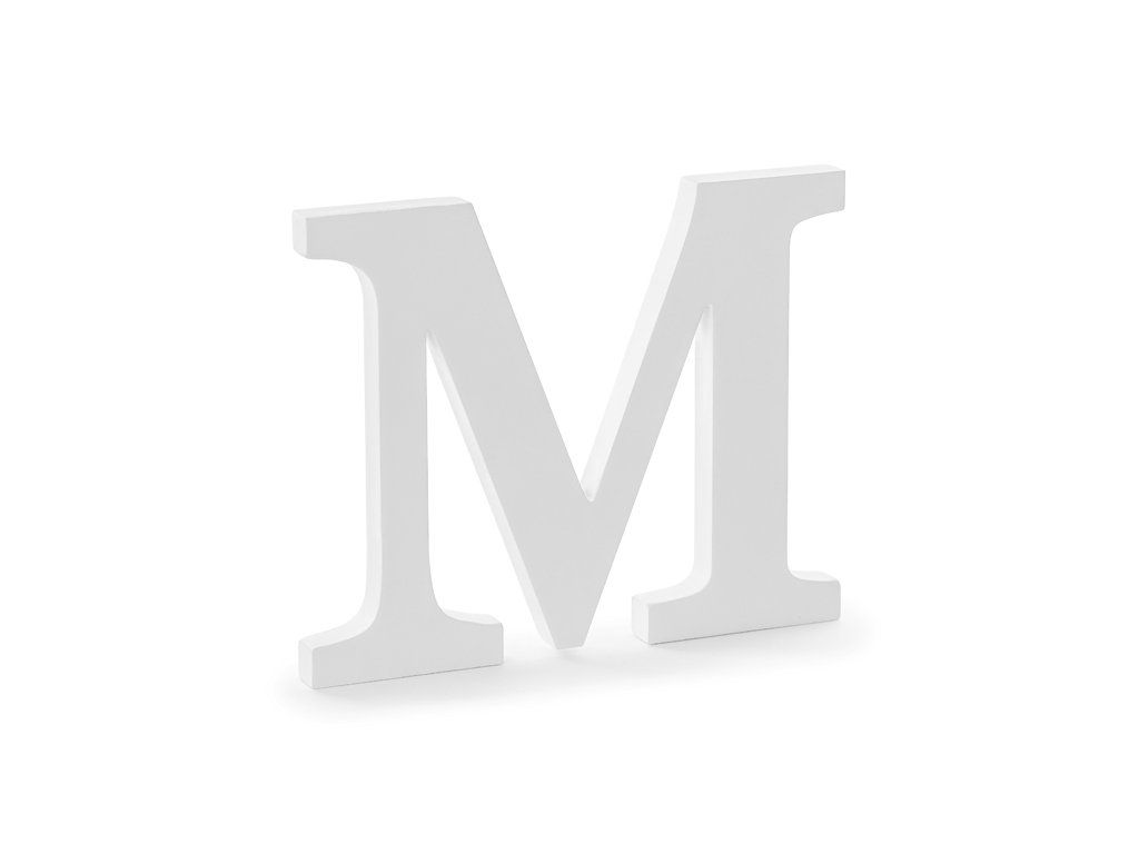 Dřevěné písmeno M bílé barvy, šířka cca 25 cm, výška cca 20 cm.