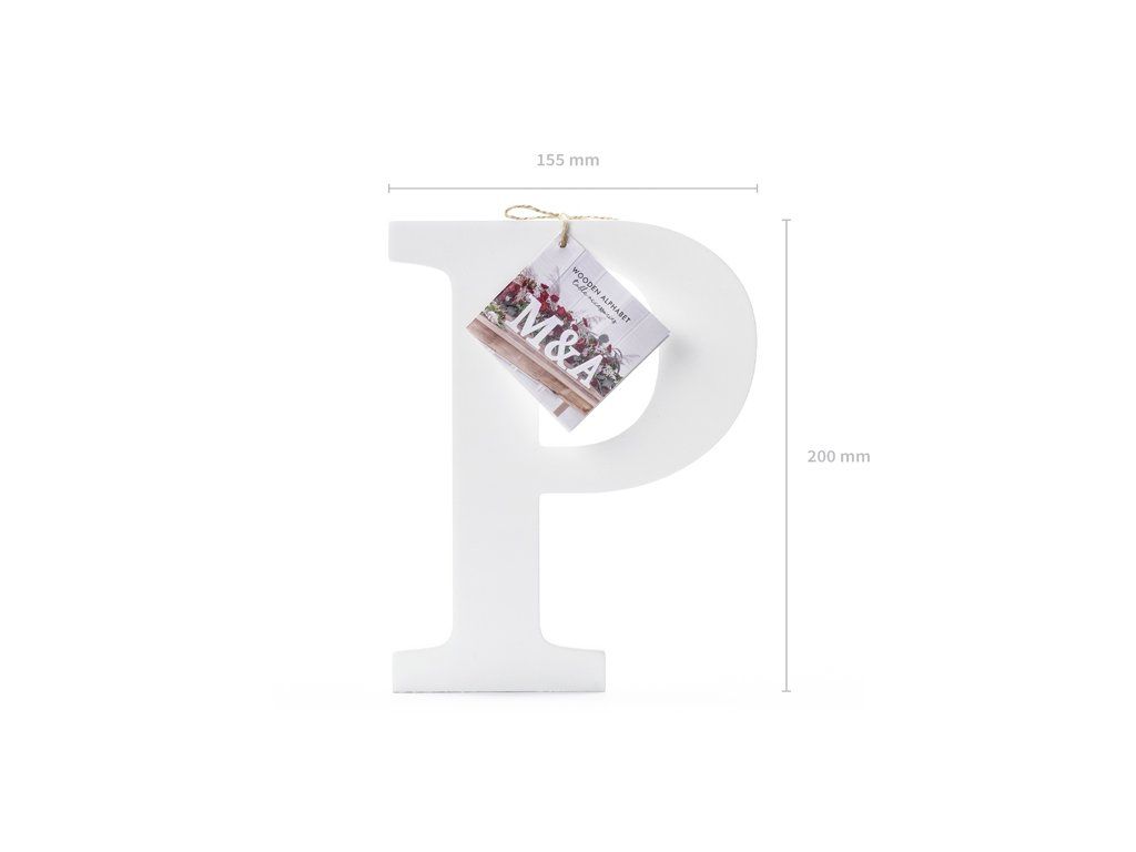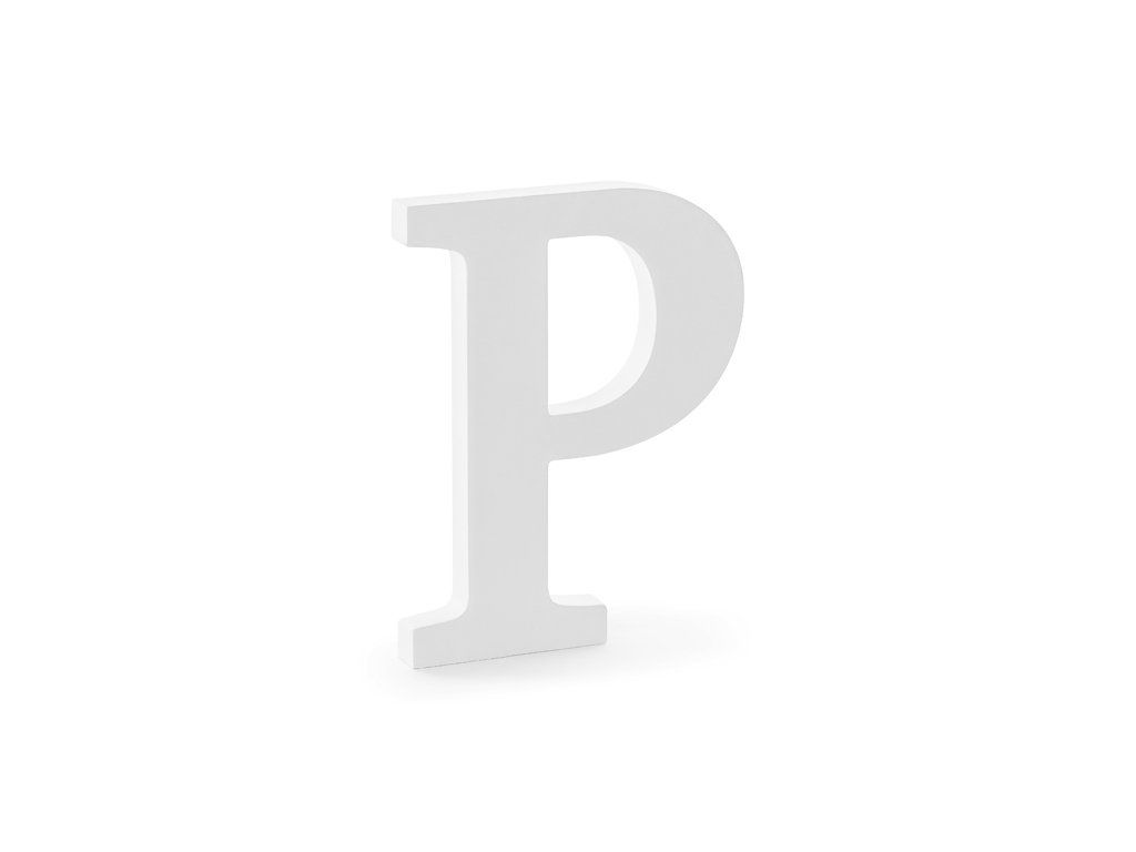 Dřevěné písmeno P bílé barvy, šířka cca 15,5 cm, výška cca 20,5 cm.