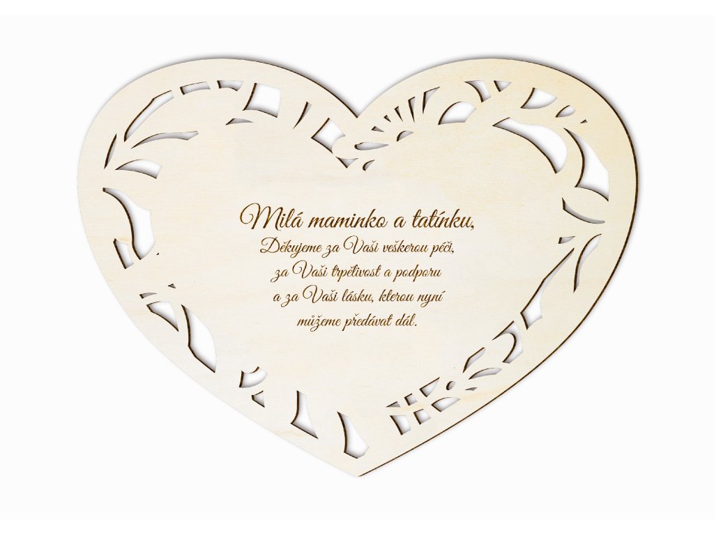Poděkování rodičům patří k nejsilnějším okamžikům svatebního dne. Toto dřevěné srdce s jemným ornamentem představuje symbol lásky, vděčnosti a úcty za vše, co pro vás rodiče během života udělali.