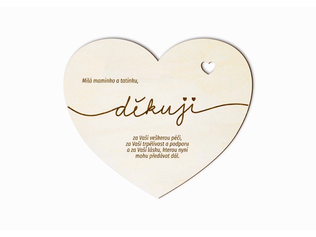Poděkování rodičům patří k nejsilnějším momentům svatebního dne. Toto dřevěné srdce s jemným gravírováním je krásným symbolem vděčnosti, lásky a úcty. Citlivě zvolený text vyjádří vše, co se někdy těžko říká slovy.