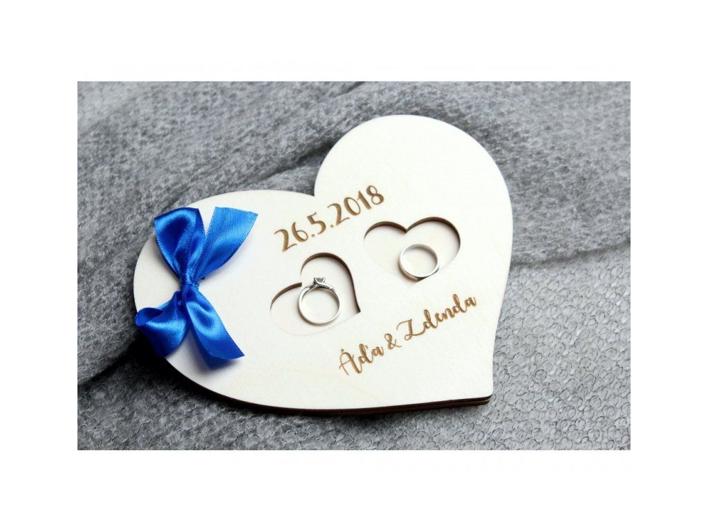 Dřevěné srdce na svatební obřad jako podnos pro snubní prsteny. Prohlubeň srdíček na prstýnky je 4 mm.