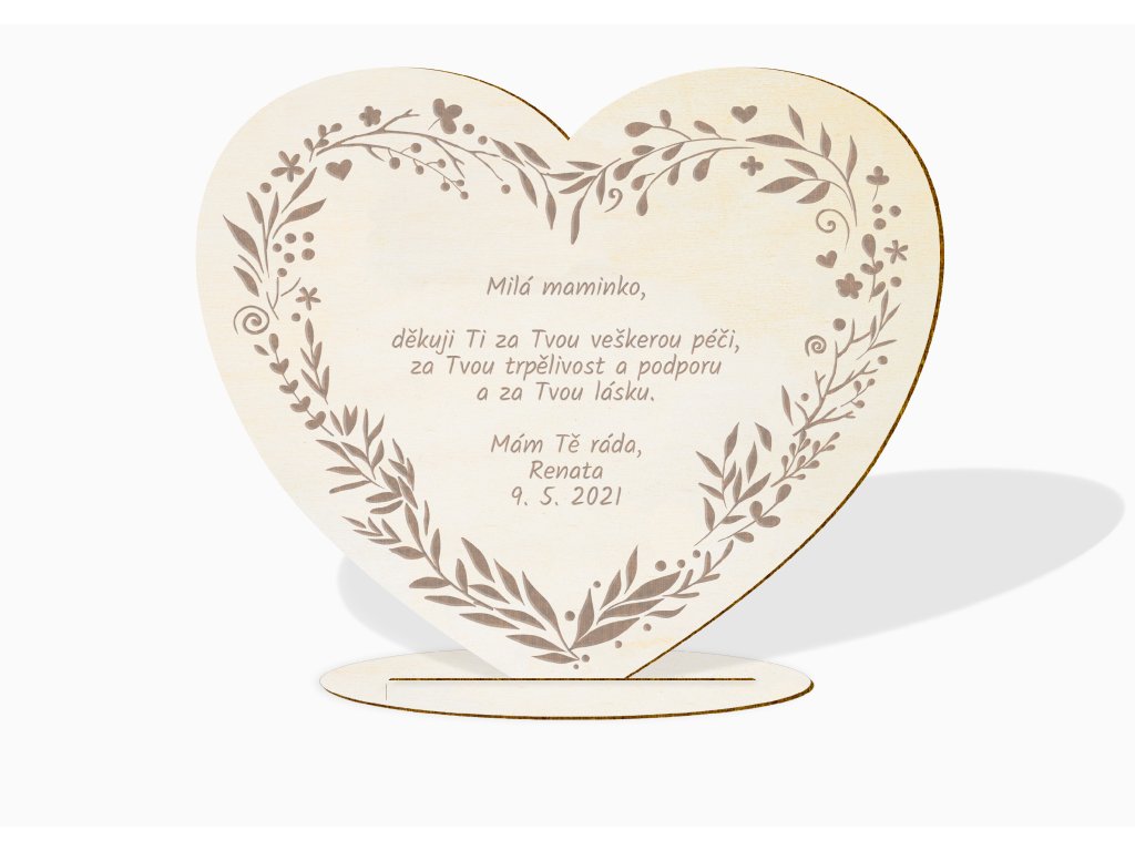 Text na srdci upravíme přesně podle vašeho přání – můžete doplnit jméno maminky, tatínka nebo obou rodičů, osobní vzkaz, datum nebo krátké poděkování. Každý kus tak vznikne jako jedinečná památka na celý život.