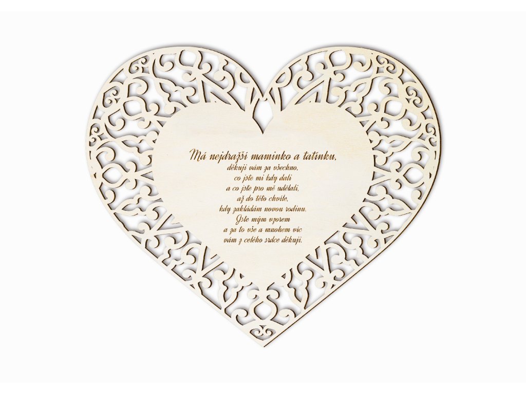 Poděkování rodičům patří k nejdojemnějším okamžikům celého svatebního dne. Toto dřevěné srdce s bohatým vyřezávaným ornamentem a citlivě zvoleným textem je krásným symbolem vděčnosti, lásky a úcty, kterou k rodičům cítíte.