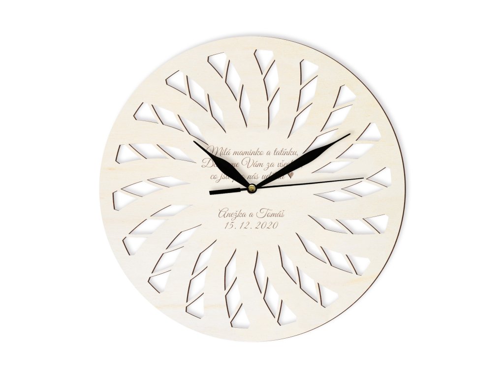 Hodiny lze upravit přesně podle vašich přání – doplnit jména, datum svatby nebo krátké věnování. Každý kus je vyráběn na zakázku, díky čemuž vzniká originální dekorace s osobním příběhem.