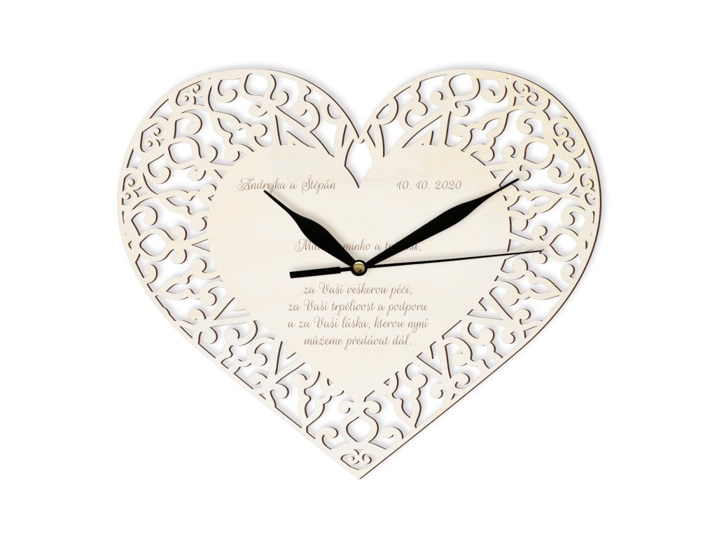 Tyto svatební hodiny ve tvaru srdce zaujmou na první pohled svým detailním vyřezávaným ornamentem, který symbolizuje lásku, propojení a výjimečný okamžik svatebního dne. Díky osobnímu textu uprostřed vzniká nejen dekorace, ale i trvalá památka s hlubokým významem.