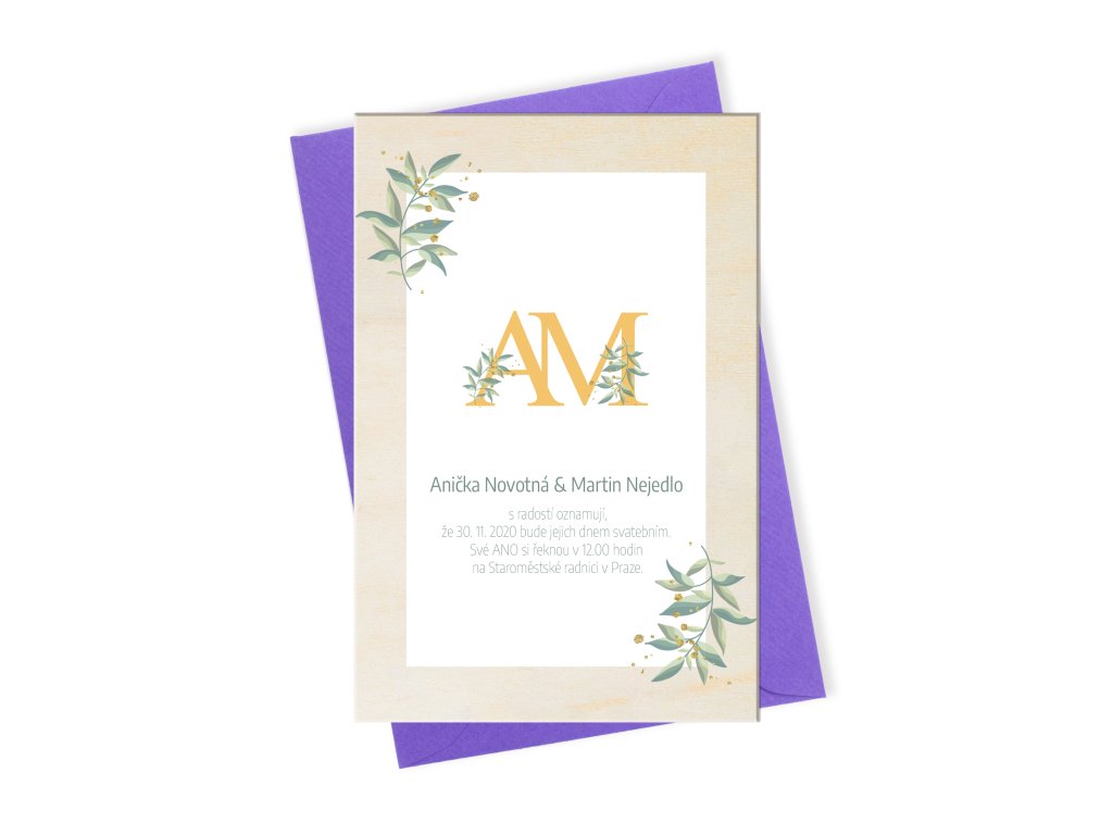 Svatební oznámení s iniciálami je krásným symbolem spojení dvou lidí. Jemný botanický motiv dodává oznámení lehkost a eleganci, zatímco přírodní dřevo podtrhuje jeho výjimečnost. Skvěle se hodí ke svatbám v přírodním, romantickém i moderním stylu.