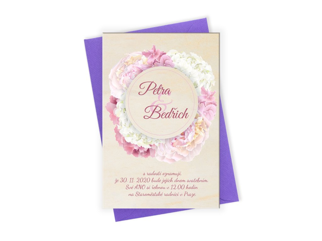 Dřevěné svatební oznámení s květinovým věncem – gravírované
