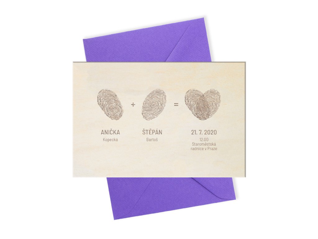 Dřevěné svatební oznámení s otisky prstů – gravírované