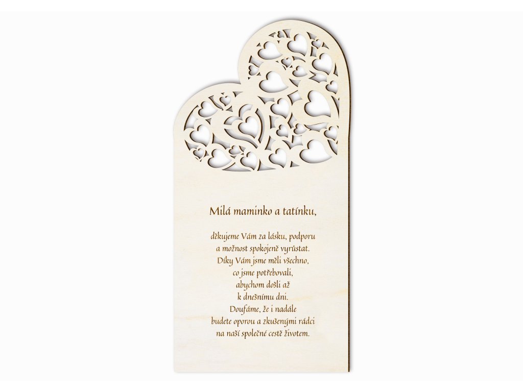 Poděkování rodičům je jedním z nejsilnějších momentů svatebního dne. Toto dřevěné poděkování s vyřezávanými srdci symbolizuje lásku, podporu a vděčnost, kterou chcete svým rodičům předat od srdce.