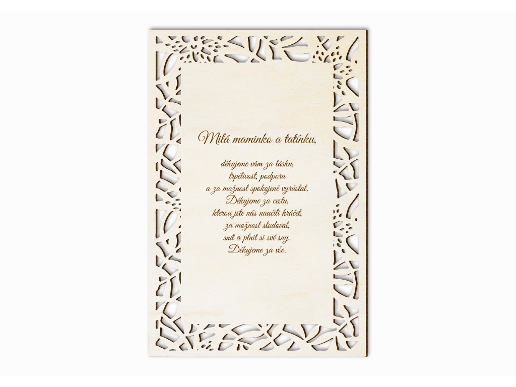 Poděkování rodičům patří k nejemotivnějším částem svatebního dne. Toto dřevěné poděkování s bohatě vyřezávaným rámem působí slavnostně, jemně a zároveň velmi osobně. Je ideální volbou pro chvíli, kdy chcete říct „děkujeme“ od srdce.