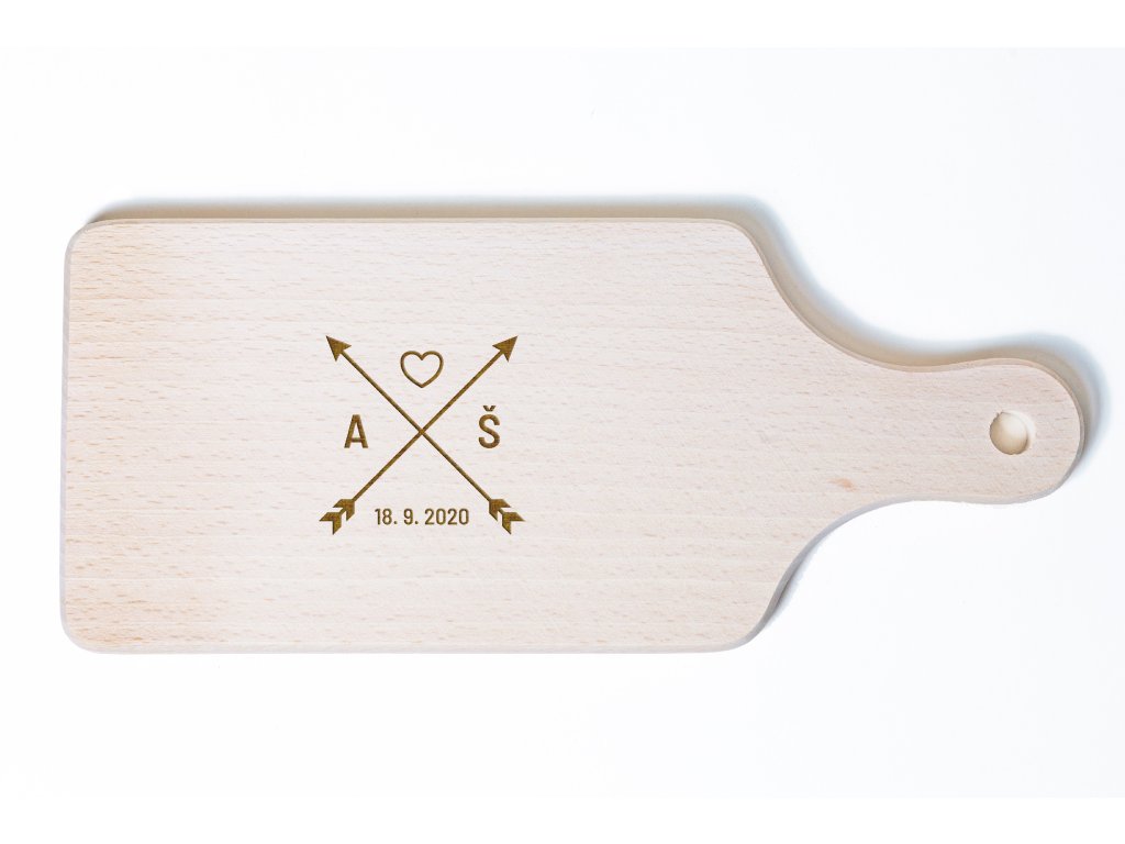 Toto dřevěné svatební prkénko s iniciálami a datem svatby je krásným symbolem spojení dvou lidí. Motiv zkřížených šípů se srdcem vyjadřuje lásku, směr a společnou cestu, na kterou se novomanželé vydávají. Prkénko se tak stane nejen praktickým pomocníkem, ale i trvalou vzpomínkou na svatební den.