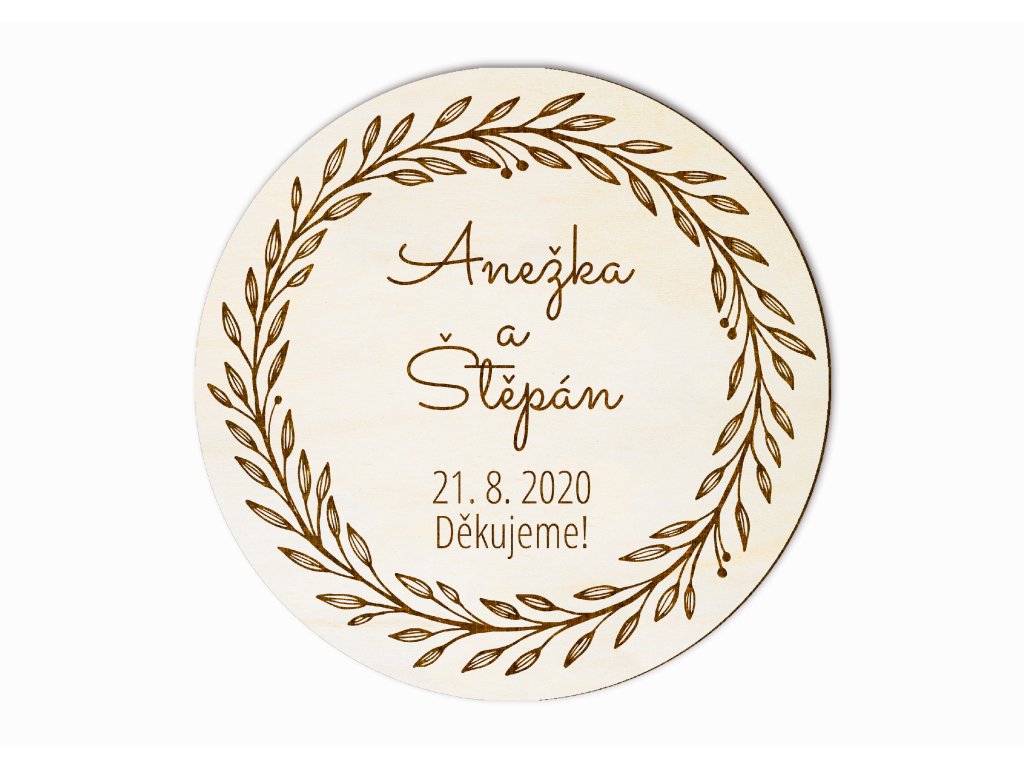 Dřevěný svatební magnet s gravírováním – věnec se jmény