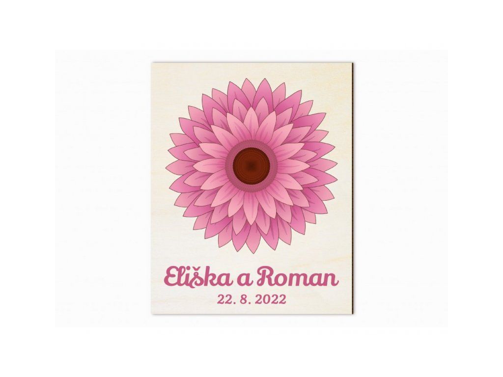 Dřevěný svatební "strom" s potiskem gerbery určený pro podpisy hostů. Gerbera má celkem 64 okvětních plátků pro podpis.