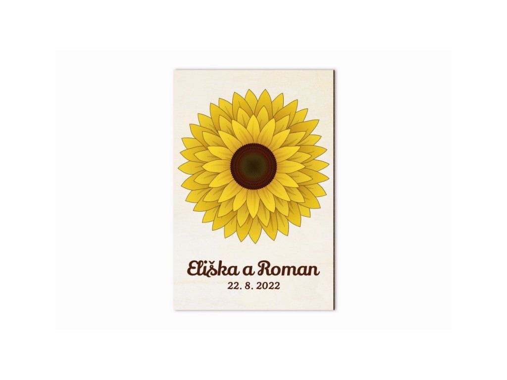 Dřevěný svatební "strom" s potiskem slunečnice určený pro podpisy hostů.