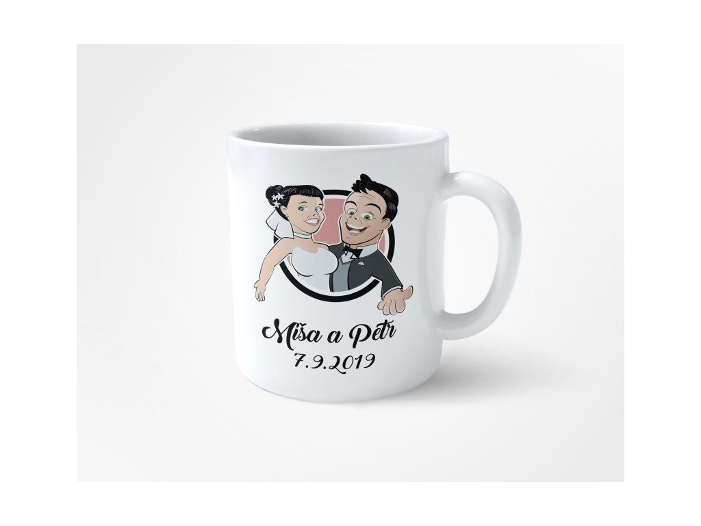 Hrníček s potiskem zamilovaného páru a vašimi jmény a datem svatby - tyto údaje zadejte do políčka nad tlačítkem "Do košíku".