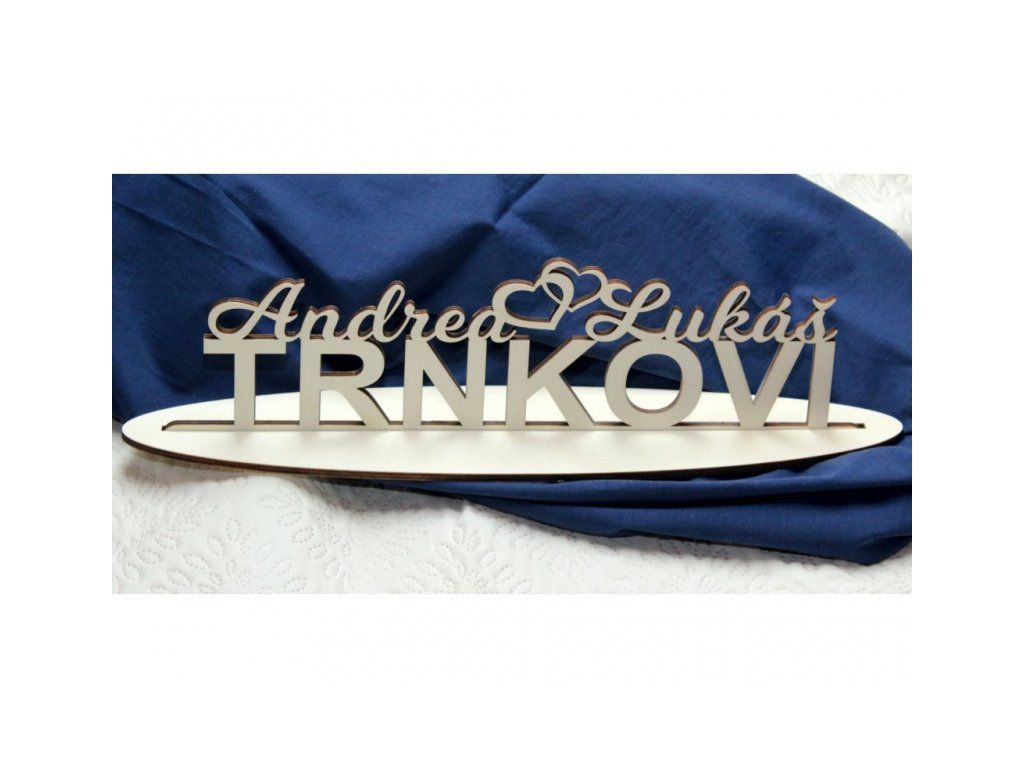 Jména a příjmení zamilované dvojice jako doplněk na svatbu nebo jen jako dekorace do domova. Nápis je zasazen do praktického stojánku.