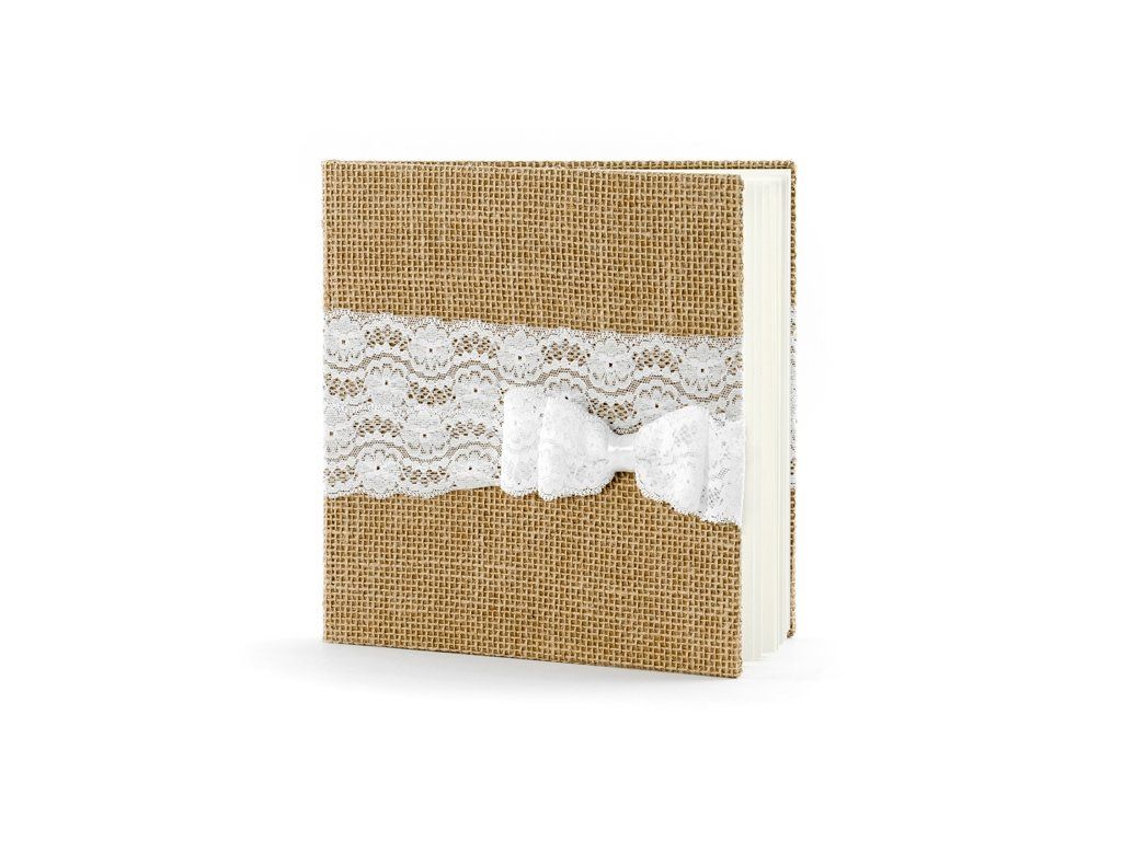 Jutová kniha hostů s krémovou krajkou a krémovou mašlí.Doplňkové parametry