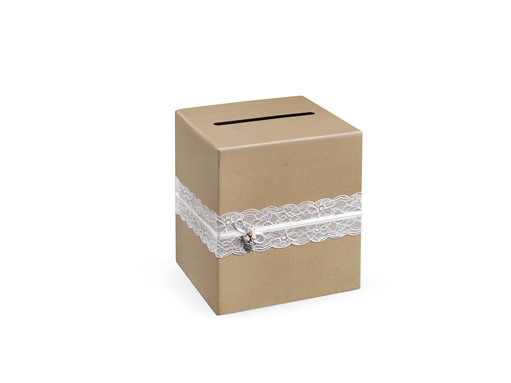 Hnědá kartonová krabička na přání zdobená bílou krajkou se světle růžovými růžičkami a přívěskem srdíčka. Velikost 24 x 24 x 24 cm.Doplňkové parametry