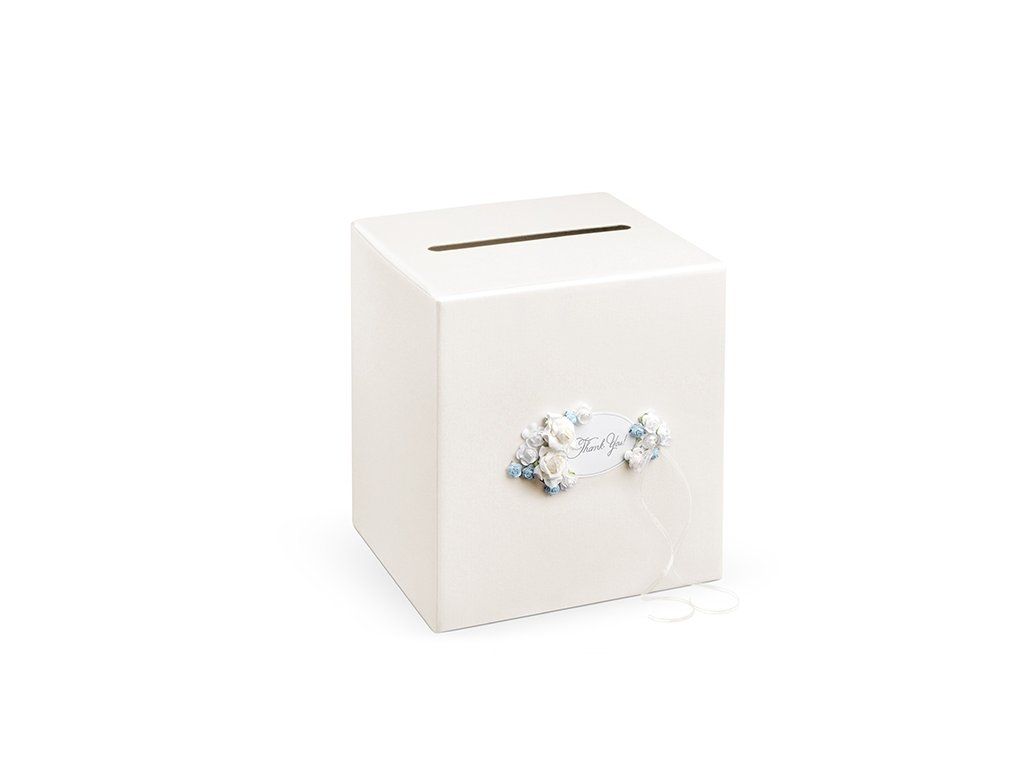 Krabička na přání z krémového perleťového papíru zdobená krémovo-modrými kvítky a nápisem Thank You! Velikost 24 x 24 x 24 cm.Doplňkové parametry