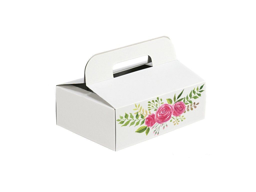 Velmi kvalitní stabilní krabička na zákusky s uchem, pevná. Boční zarážky na oušku zabraňují otevírání krabičky. Vyrobena z kvalitní velmi pevné bílo-šedé papírové strojní lepenky. Výška i s ouškem 12,5cm. Dodáváme v rozloženém stavu.Buďte první, kdo napíše příspěvek k této položce.