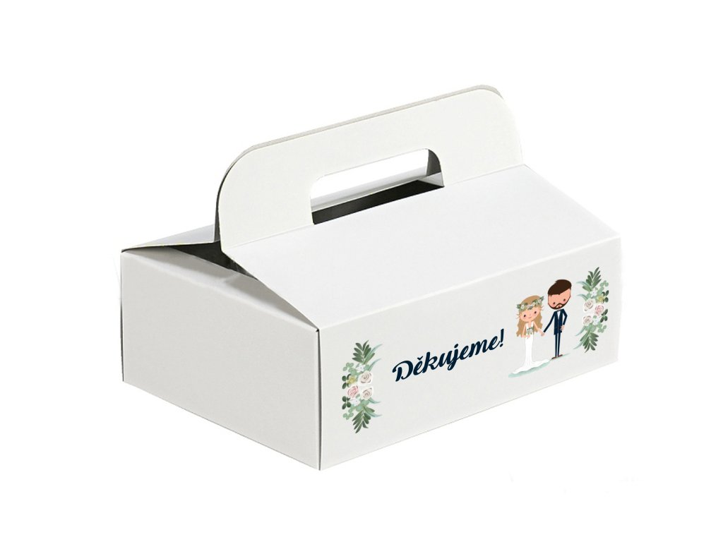 Krabička s ilustrací novomanželů a nápisem „Děkujeme“ je milou pozorností, která hostům připomene váš svatební den ještě dlouho po jeho skončení.