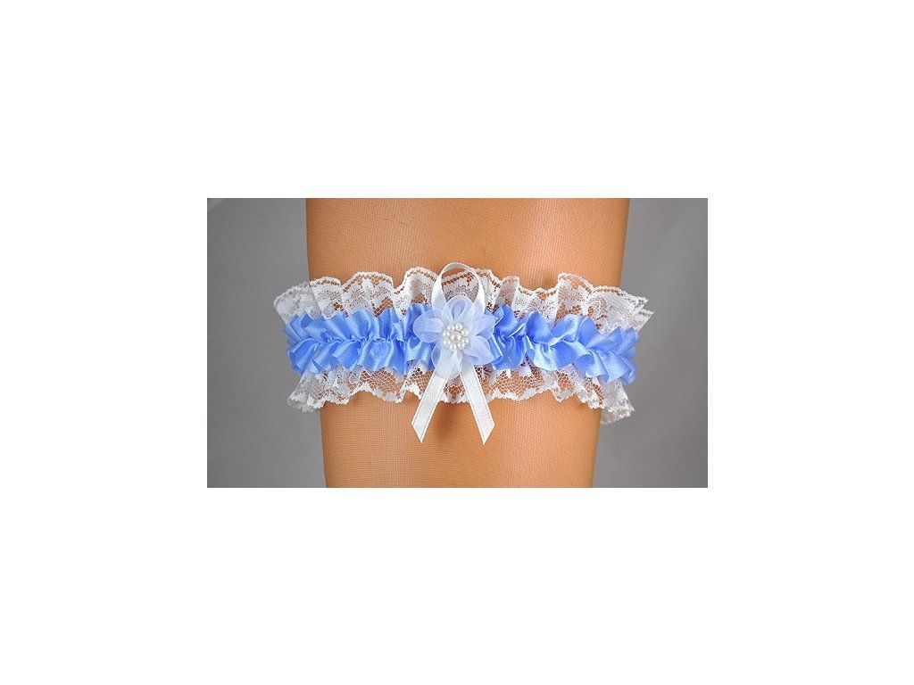 Svatební krajkový podvazek zdobený uprostřed modrou saténovou stuhou, která je zdobena kytičkou. Šířka podvazku - 5,5 cm. Podvazek je pružný a díky všité gumě se natáhne až do obvodu 62 cm.