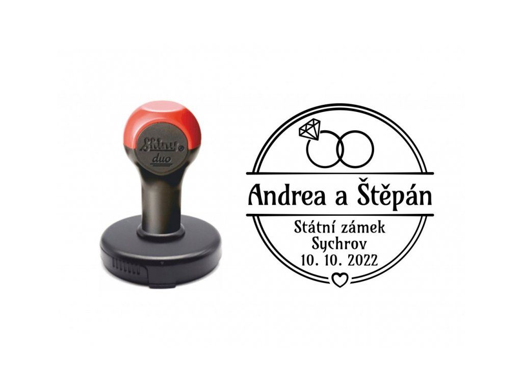 Svatební razítko vám poslouží na ozdobu svatebních obálek, svatebních jmenovek nebo je vhodné i na svatební krabičky. Průměr razítka je 37mm.