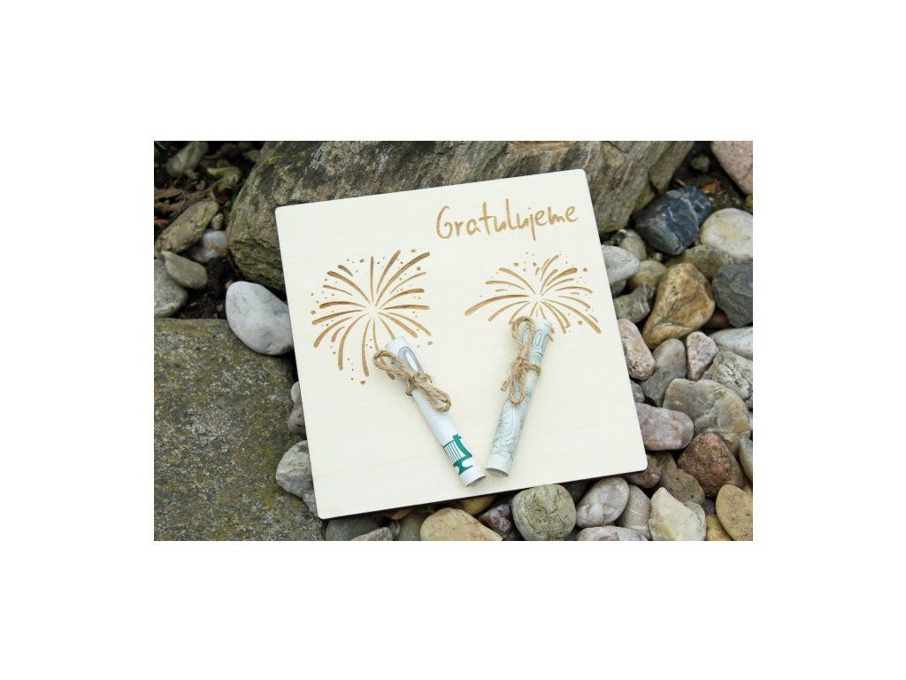 Dřevěné přání pro novomanžele nebo oslavence umožňuje darovat peníze originální cestou. Bankovky se srolují do ruličky a přichytí provázkem nebo stužkou (není součástí produktu). Výborná možnost, jak originálně darovat peníze.Buďte první, kdo napíše příspěvek k této položce.