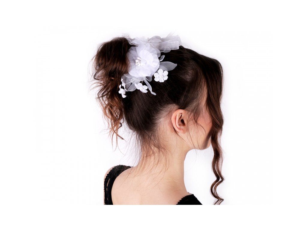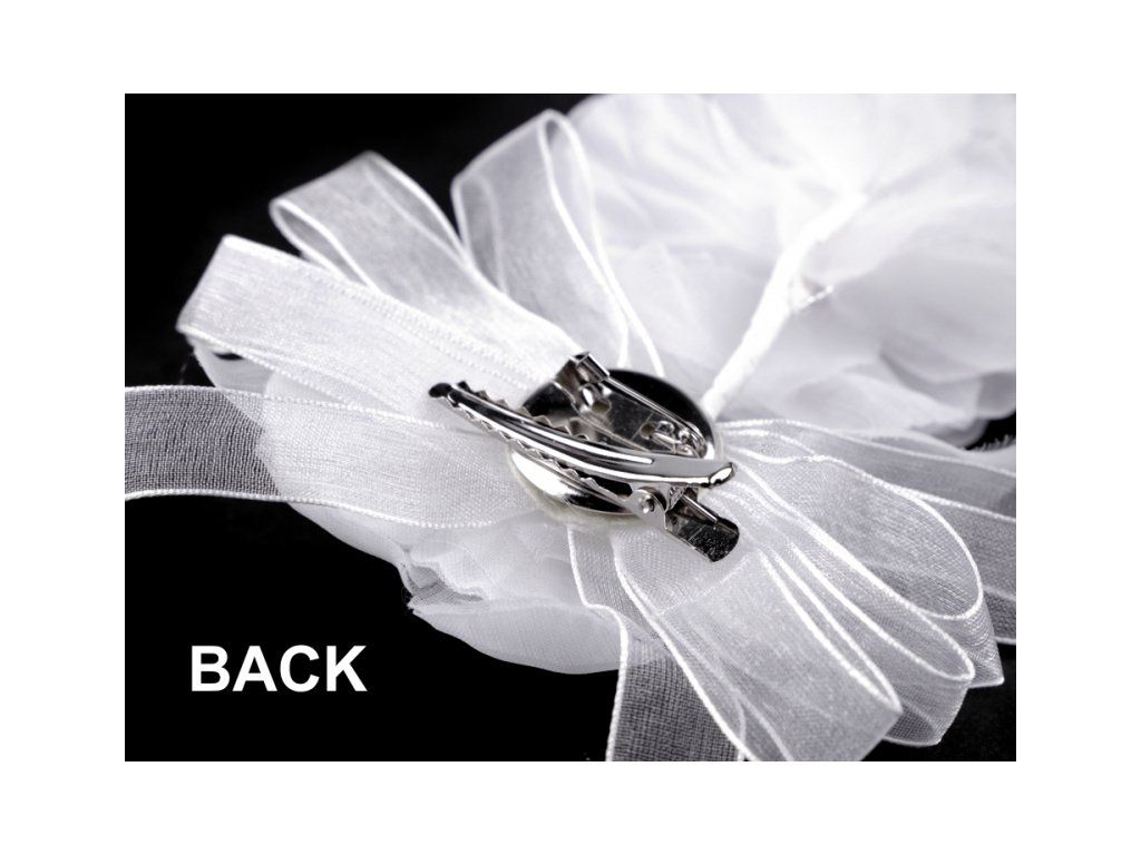 Díky drátěnému základu můžete květy tvarovat. Střed velkého květu zdobí pestíky a střed malého kvítku perličku. K jednomu z květů je připevněn klips se zoubky, který má i brožové zapínání.