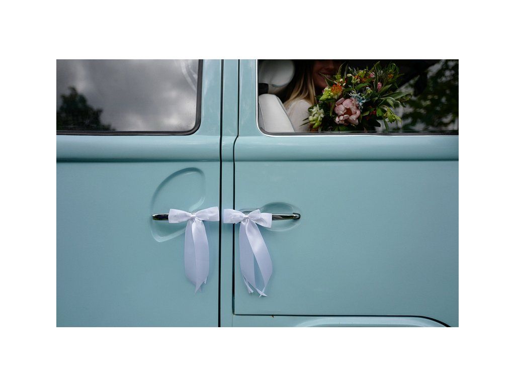 Bílé mašle na kliky auta vyrobené v kombinaci saténové a šifónové stuhy. Velikost mašle je cca 14 cm. Balení obsahuje 4ks mašlí.Doplňkové parametry