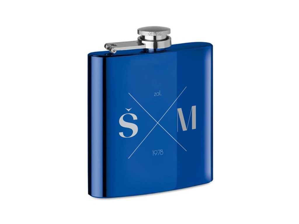 Tato personalizovaná modrá placatka s monogramem zaujme čistým a nadčasovým designem. Minimalistické provedení s iniciálami je ideální volbou pro ženicha, svědka nebo stylový svatební doplněk, který se stane krásnou památkou na výjimečný den.